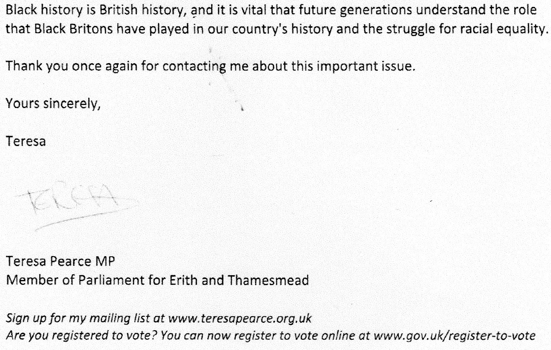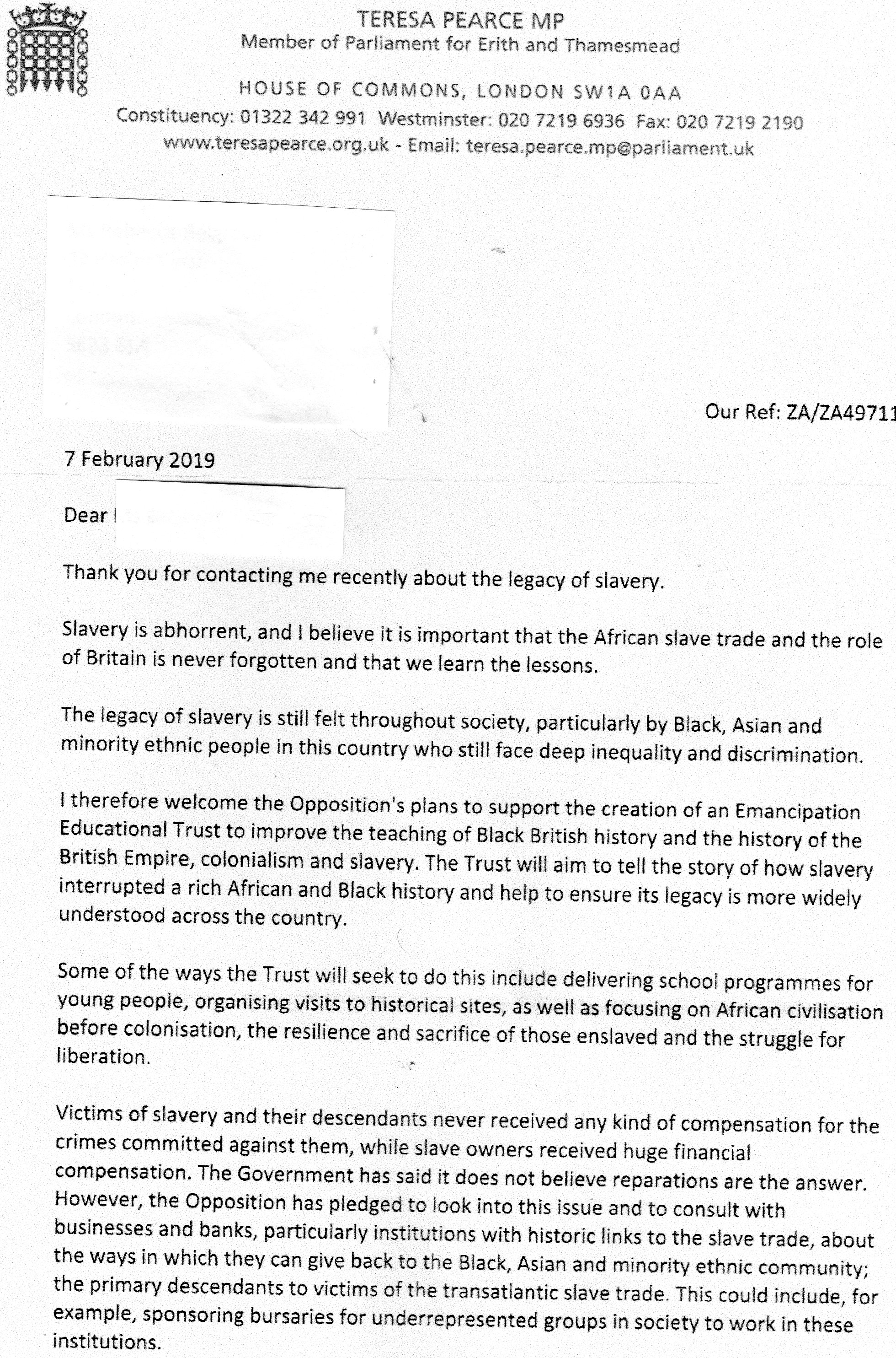 The response below, dated 7 February 2019, was received by Sis Dan, who sent a copy of the ‘Stop the Maangamizi! template letter to her MP Teresa Peace. The letter requests that MPs as elected officials “contribute to halting and reversing the enduring injustices of the Maangamizi for Afrikan Heritage Communities by: