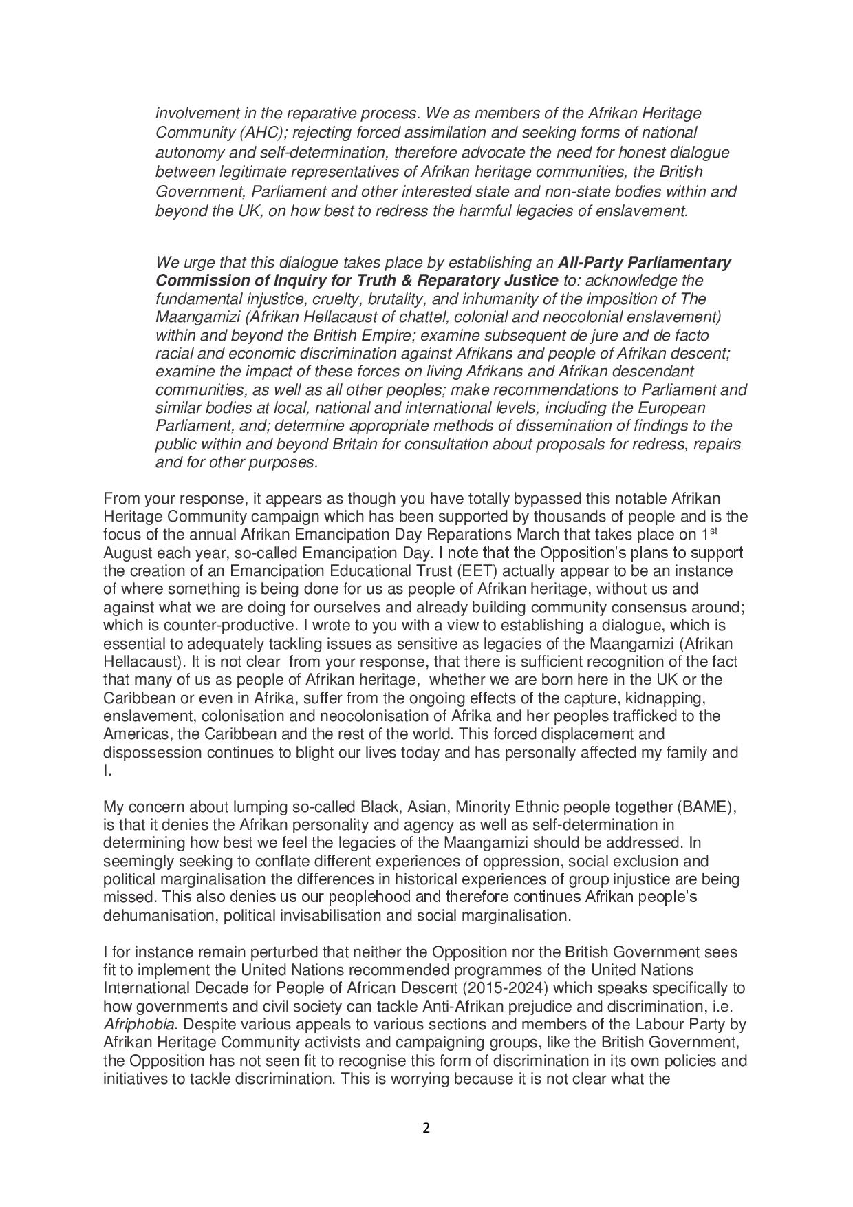 3. Supporting the Afrikan Heritage Communities’ (AHC) demand for the establishment of UK and EU All-Party Parliamentary Commissions of Inquiry for Truth & Reparatory Justice.”