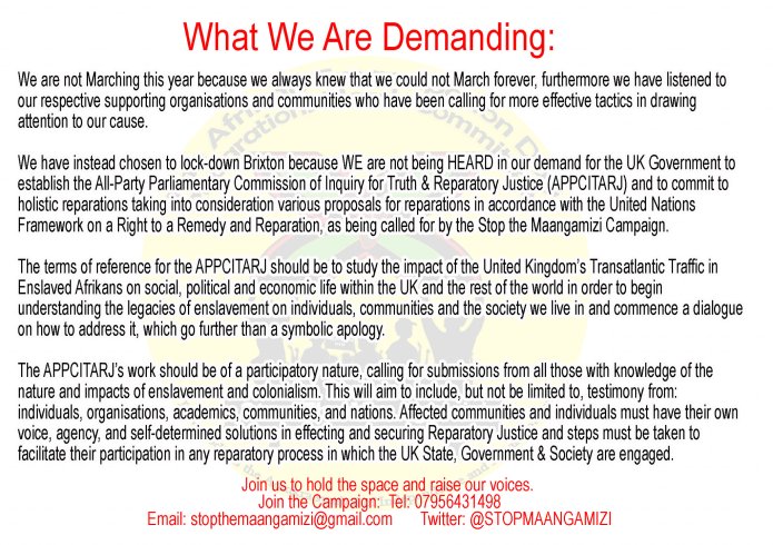 “We call upon the British state to honour the need and right of the descendants of the enslaved to speak in a public forum, provide testimony and evidence of how the legacies of enslavement are resulting in continued human and peoples’ rights violations, impaired quality of life and the ensuing destruction of the essential foundations of life for Afrikan people today.”