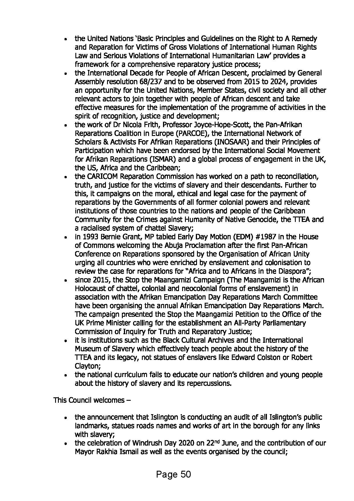The Reparations and Atonement motions build on recognition of the fundamental rights of People of Afrikan descent as advanced by the Durban Declaration and Programmes of Action arising from the 2001 World Conference Against Racism, Racial Discrimination, Xenophobia and Related Intolerance (WCAR), the Programme of Activities of the 2015-2024 United Nations International Decade for People of African Descent (IDPAD) and the 2019 Resolution on the Fundamental Rights of People of African Descent passed by the European Parliament.