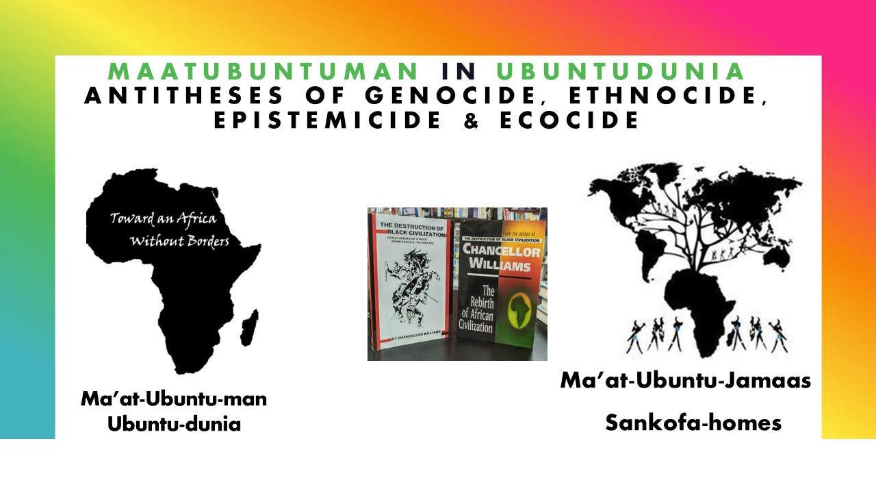 Maatubuntujamaas are Afrikan Heritage Communities for National Self-Determination that are regenerating themselves to become autonomous polities of national self-determination in the Afrikan Diaspora integrated into Sankofahomes. Sankofahomes (literally meaning a return to one’s Motherland) are indigenous communities in Afrika that are regenerating themselves purposefully to facilitate the integration of Maatubuntujamaas in the Diaspora. These Maatubuntujamaas are a form of non-territorial autonomy whereby we as a people build autonomous institutions of self-governance focusing on areas of Afrikan Heritage Community Self-Repairs such as education, healthcare, and community cooperative enterprise, for example.