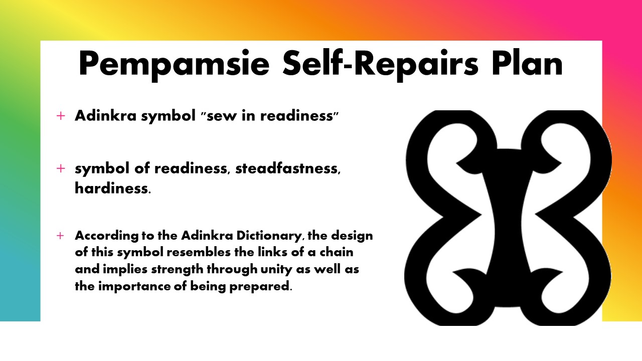 Pempamsie is the Adinkra symbol for sewing together in readiness -preparatory actions for reparatory justice. building our future out of our principled operational unity despite our diversity. Indeed, part of the repair process is about Afrikan heritage communities developing our own community capacity and power-base as well as our own Afrikan Heritage Community Self-Repairs Plans. Mpango is the Kiswahili word for plan.