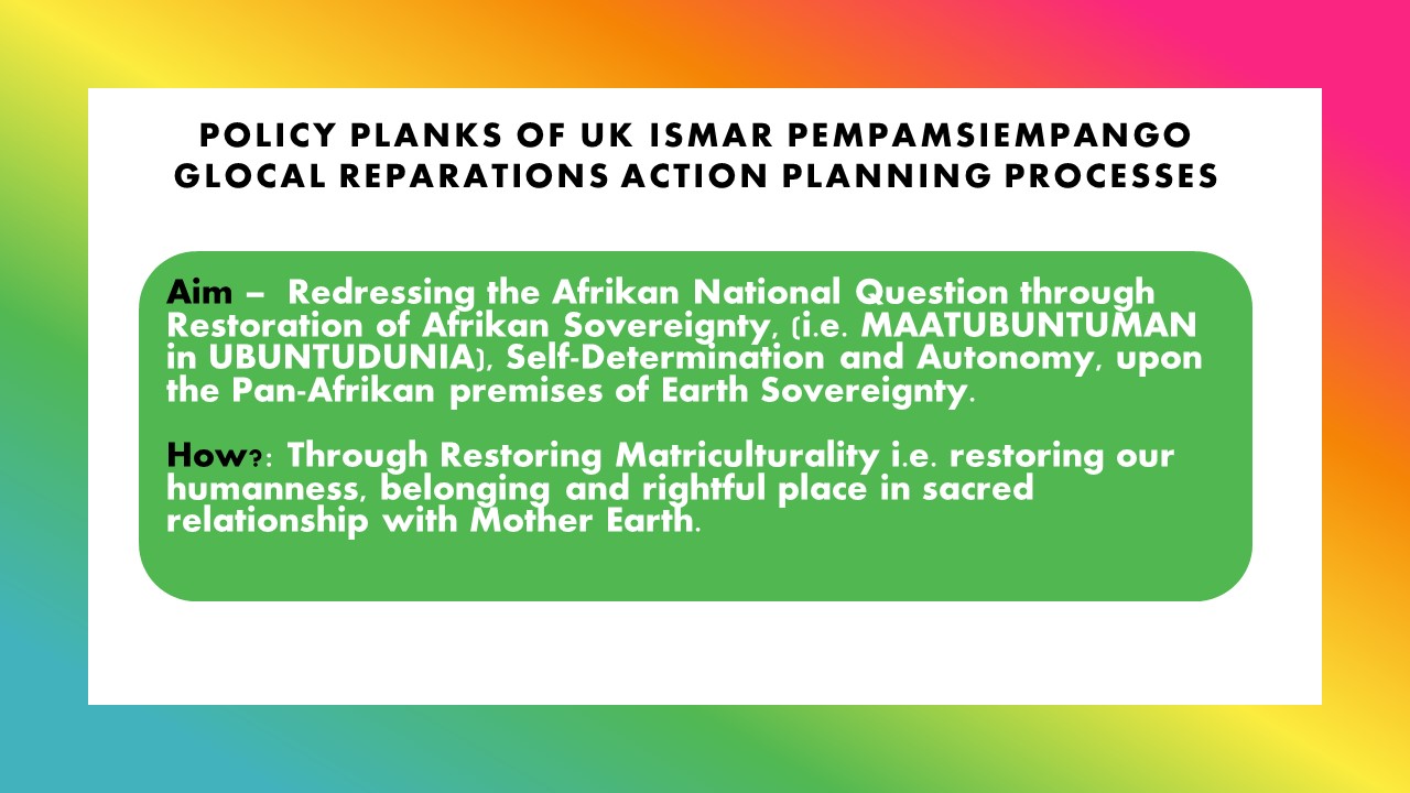 This will also lead to you learning how to demystify law to others and assist them to raise their own legal consciousness to enable them to actively play their global citizenship role in exercising their right to be the actual makers of domestic and international law. Furthermore, you can be actively engaged, in which ever country you reside, in the creation and advancement of domestic and international law, for example, particularly in pressurising to ensure the criminalisation of ecocide and the outlawing of eco-fascism, defending our collective (group) rights to Self-determination and protecting our geopolitical interests as Afrikans. It is important for us to organise within our communities glocally to be the reparatory, environmental and cognitive justice changes we wish to see in terms of Afrikan Heritage Communities taking responsibility for leading in the development of a participatory democratic PEMPAMSIEMPANGO Glocal Reparations Action Plan for Planet Repairs Alternative Progression (PEMPAMSIEMPANGO-GRAPPRAP). Such plans can be developed locally, regionally and internationally through joining or seeking advice to create, wherever you are, units of the PEMPAMSIESAFO Pan Afrikan Reparatory Justice Special Task Action Research Forces (PEMPAMSIESAFO-PARJSTARFs). Your unit can contribute its work to developing, in your own locality, proceedings towards the All-Party Parliamentary Commission of Inquiry for Truth & Reparatory Justice (APPCITARJ). By the time the APPCITARJ is established it is expected that the Pempamsiempango(s) will form part of the proposals for redress and repair which the UK Government will be compelled to adhere to, according to the dictates of how well we can harness and deploy our own Afrikan People’s Power glocally.