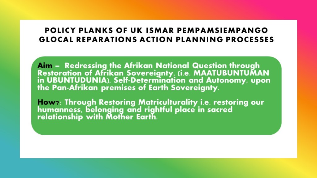 Developing such mechanisms will redress the democratic deficit and creatively foster self-governance and forms of autonomy which Afrikans within and beyond the UK are self-actualising in their campaigning for Pan-Afrikan Reparations to win Planet Repairs in its Global Justice meaningfulness. This is being done in accordance with the Blackprint of the Handbook of Revolutionary Warfare by Osagyefo Kwame Nkrumah; with emphasis upon the Pempamsiempango planning for Glocal Pan-Afrikan Community Regeneration, by our own People’s ‘Black Power’, of our Community Resistance Zones such as ‘Maatubuntujamaas‘ (Afrikan Heritage Communities for National Self-Determination) in the Diaspora, indivisibly linked organically to ‘Sankofahomes‘ inside our indigenous Afrikan Communities of Resistance throughout the continent of Afrika.