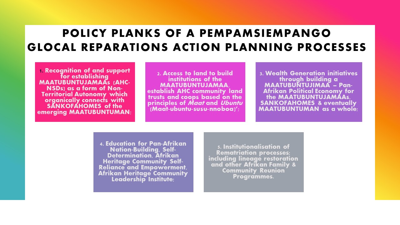 The process of Pempamsiempango (reparations planning) should occur within the context of a glocal framework which is establishing repaired Afrikan Heritage Communities which are referred to as Afrikan Heritage Communities for National Self-Determination (AHCs-NSDs)/ Maatubuntujamaas in the UK and other parts of the Diaspora which organically builds links with such Communities of Resistance and Communities of Reparatory Justice Interest on the Continent of Afrika which are known as Sankofahomes.