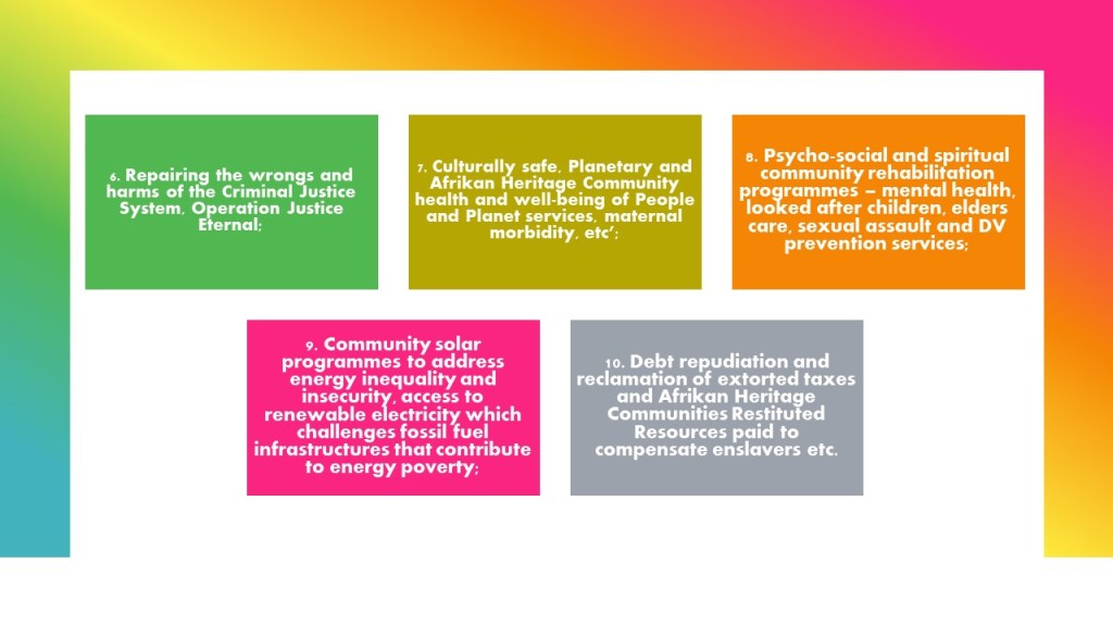 4.       Recognise that reparative justice should be driven by Afrikan Heritage Communities experiences, voices and perspectives to ensure that advocacy messages not only reflect but also respond to the real needs of the community in order to recognise inequalities.