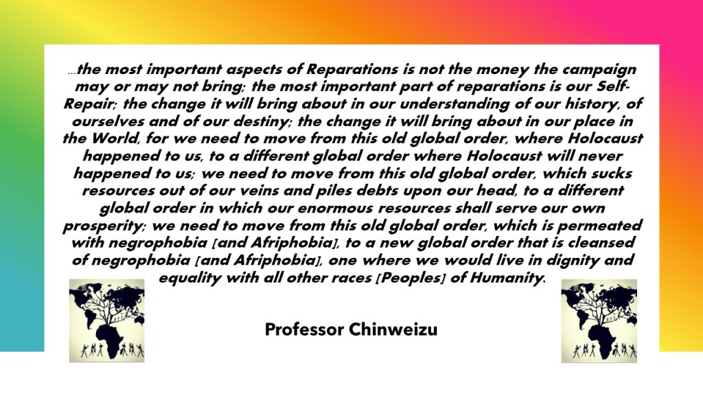 The struggle for reparations for the Holocaust of Enslavement of African people is clearly one of the most important struggles being waged in the world today. For it is about fundamental issues of human freedom, human justice and the value we place on human life in the past as well as in the present and future. It is a struggle which, of necessity, contributes to our regaining and refreshing our historical memory as a people remembering and raising up the rightful claims of our ancestors to lives of dignity and decency and to our reaffirming and securing the rights and capacity of their descendants to live free,full and meaningful lives in our times. But this struggle, like all our struggles, begins with the need for a clear conception of what we want, how we define the issue and explain it to the world and what is to be done to achieve it.