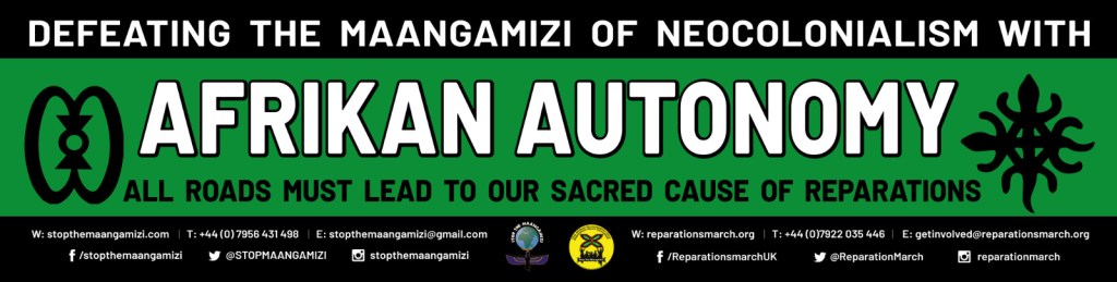 We will not get a sense of the totality of the work just by turning up for one day and then lamenting the lack of numbers or vibes on the day. The UK has always had a Pan-Afrikan approach to this grassroots movement to effect and secure holistic reparations; which means fighting for our power base in Afrika and her Diaspora wherever we are. We cannot be concerned just with our people in the UK, a mere 3% of the UK population. Neither can we NOT connect our quest for reparatory, environmental and cognitive justice (referred to collectively as Planet Repairs) to our homeland and power base Afrika from which much or the resources that prop up the greedy inhumane global North, come from. So, it is necessary to have a glocal (local and global) approach which the Stop the Maangamizi: We Charge Genocide/Ecocide! Campaign (SMWeCGEC) and her affiliated structures has been operating with.