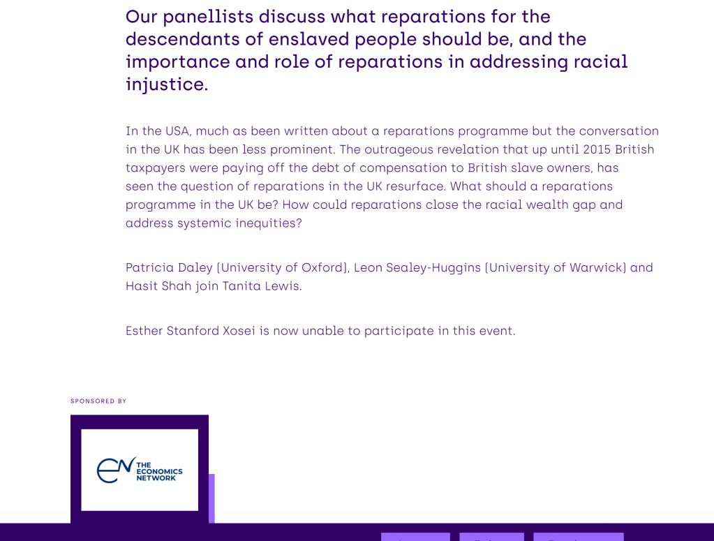 I am writing to let you know that upon further reflection, I feel compelled to withdraw my participation in the forthcoming panel discussion on ‘What are the Economics of Reparations’. Since my agreement to participate in July 2021, I have come under scrutiny from Afrikan Heritage Community Members, who have quite rightly raised concerns about the ethical and legal dimensions of the contentious admissions policy for those attending the Festival of Economics and the panel discussion on reparations.