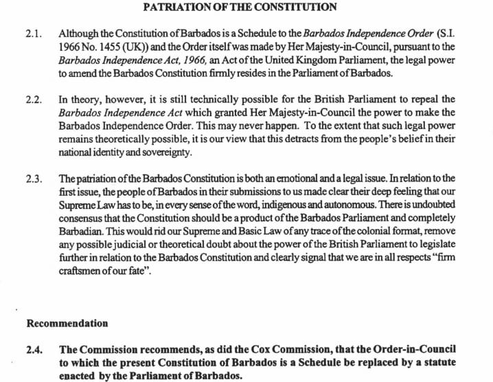 “….Barbados will move inexorably to republican status but with the status quo remaining, and with the symbolic change associated with the national head of state both practically and theoretically representing the citizens and not theoretically a foreign head of state. The real issue is therefore not about whether Barbados becomes a republic, or whether the Constitution is patriated, but about the relationship between the people and the Government as articulated in the Constitution. Is Barbados going to change its Constitution or be content with tinkering around the edges, masquerading as change?“