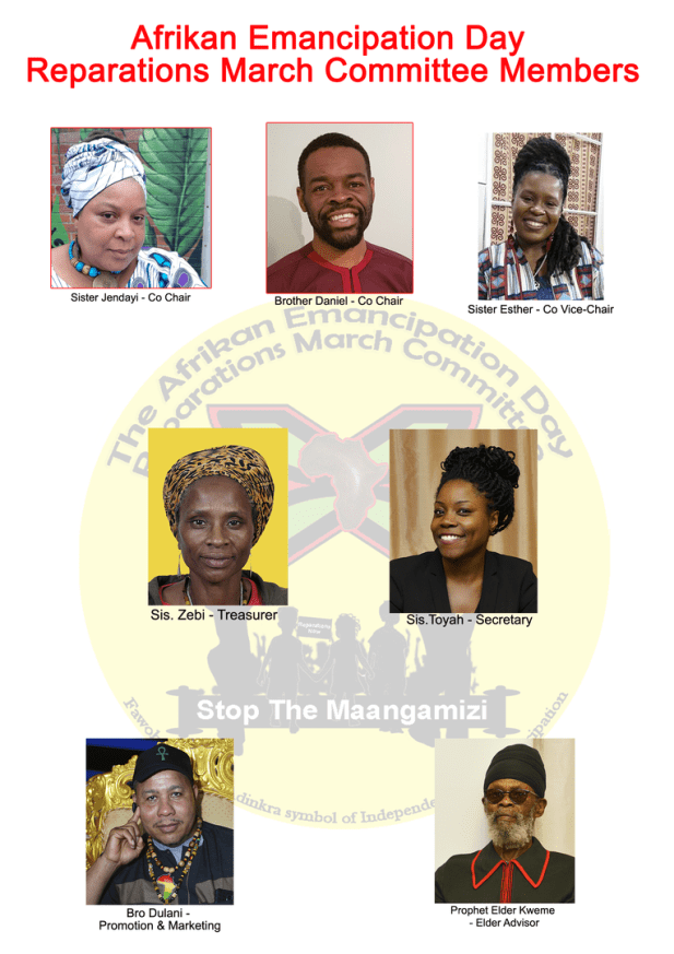 The contacts for the Afrikan Emancipation Day Reparations March Committee are as follows: