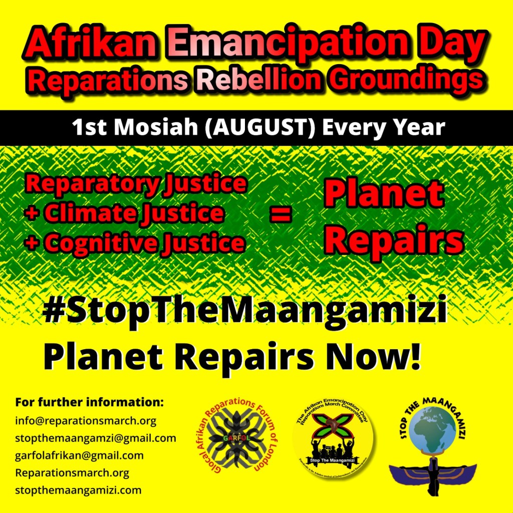 The ‘Stop the Maangamizi!’ Campaign is the official campaign partner of the Afrikan Emancipation Day Reparations March Committee (AEDRMC) together we co-facilitate the organisation of the Pan-Afrikan Reparations Rebellion Groundings (PARRG)on the 1st Mosiah (August) Afrikan Emancipation Day. The PARRG are also supported by the Extinction Rebellion Internationalist Solidarity Network (XRISN), co-founded by Stop The Maangamizi Team Members Kofi Mawuli Klu & Esther Stanford-XoseI and other leading figures within Extinction Rebellion. Between the years 2015-2019, the 1st Mosiah Commemorations took the form of the Afrikan Emancipation Day Reparations March. View the following video to find out more about the rationale for evolving the March to the PARRG.