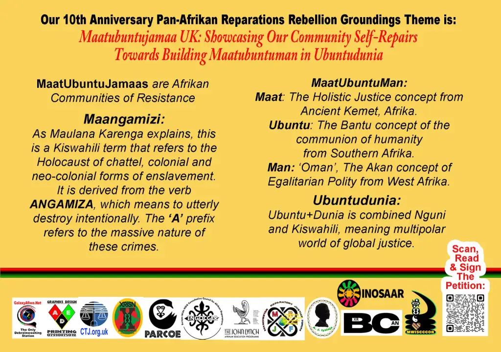 The main purpose of the PARRG is to showcase our Afrikan Heritage Communities Self-Repairs Initiatives locally, nationally and internationally and to demonstrate that the achievement of Planet Repairs (the nexus of reparatory, environmental and cognitive justice) epitomised by the building of MAATUBUNTUMAN in UBUNTUDUNIA as the overarching strategic goal of our Pan-Afrikan Reparations for Global Justice organising efforts is possible. Indeed, the PARRGs are our Afrikan Heritage Communities demonstration of the fact that a Post-Afrikan Reparations World Order is being prefigured through our acts of everyday resistance to the Maangamizi and organsing to restore to ourselves forms of Afrikan autonomy where we can exercise Self-determination in effecting and securing more enduring forms of holistic Reparatory Justice for our Ancestors, Ourselves and Future Generations.