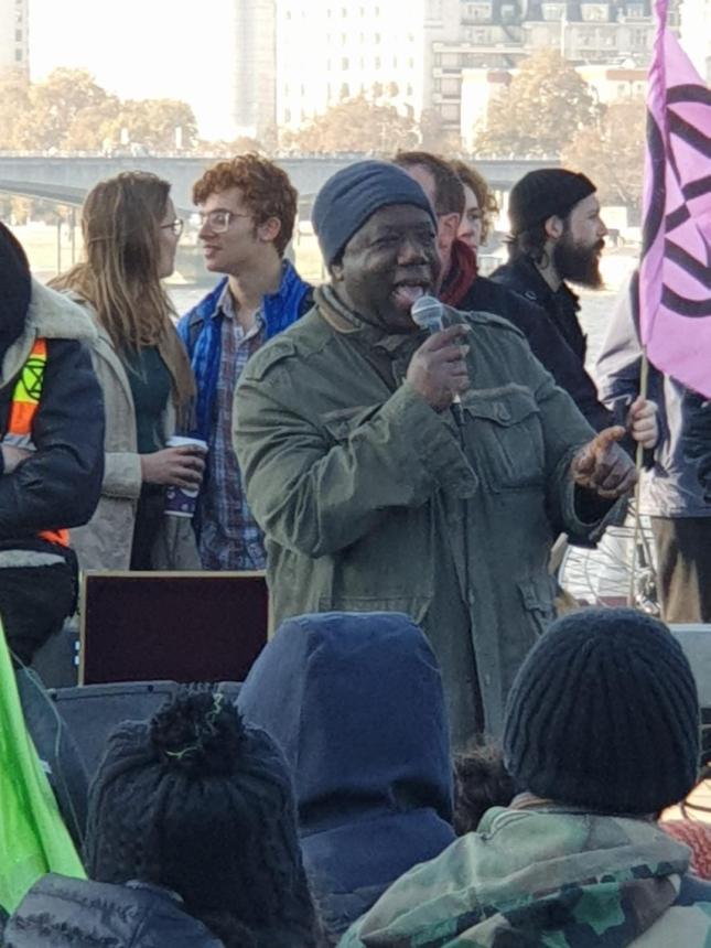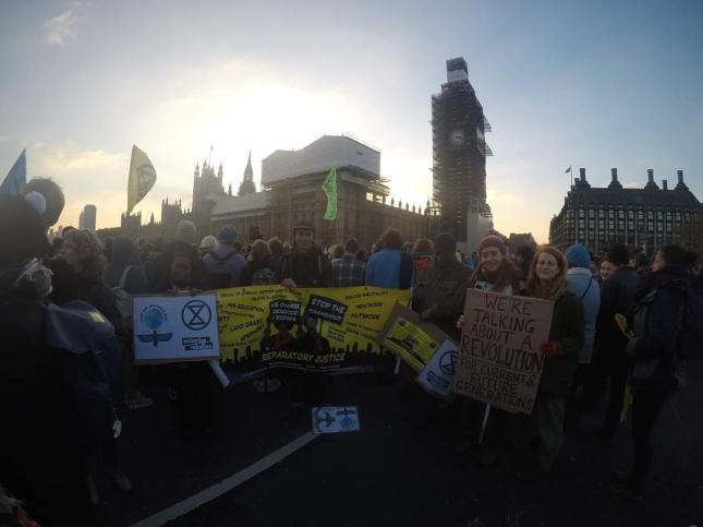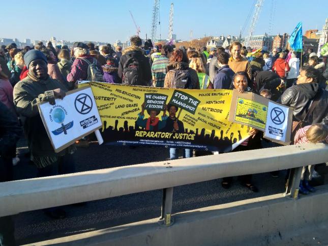 The ‘Stop the Maangamizi: We Charge Genocide/Ecocide!’ Campaign (SMWeCGEC) was represented as part of a group of global witnesses who took part in the recent #RebellionDay organised by Extinction Rebellion on Saturday 17th November 2018. The Extinction Rebellion is a movement composed of several thousand people across the UK and other parts of the world that is using nonviolent direct action, economic disruption and civil disobedience to demand action on the climate emergency. “Based on the science,” reads Extinction Rebellion’s website, “we have ten years at the most to reduce CO2 emissions to zero, or the human race and most other species are at high risk of extinction within decades.”